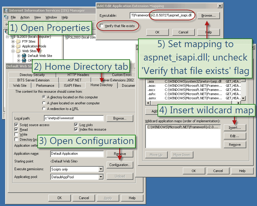 On Windows Server 2003 it is necessary to add Application Extension Mapping