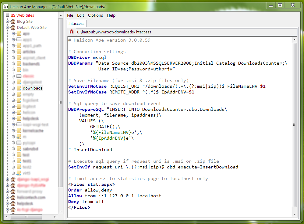 Helicon Ape module is processing all requests coming to /downloads/ folder. If .zip or .msi file is requested, Ape memorizes the filename (FileNameENV) and client IP (IpAddrEnv), from which the file was requested, and inserts these data into the table by means of SQL query.
