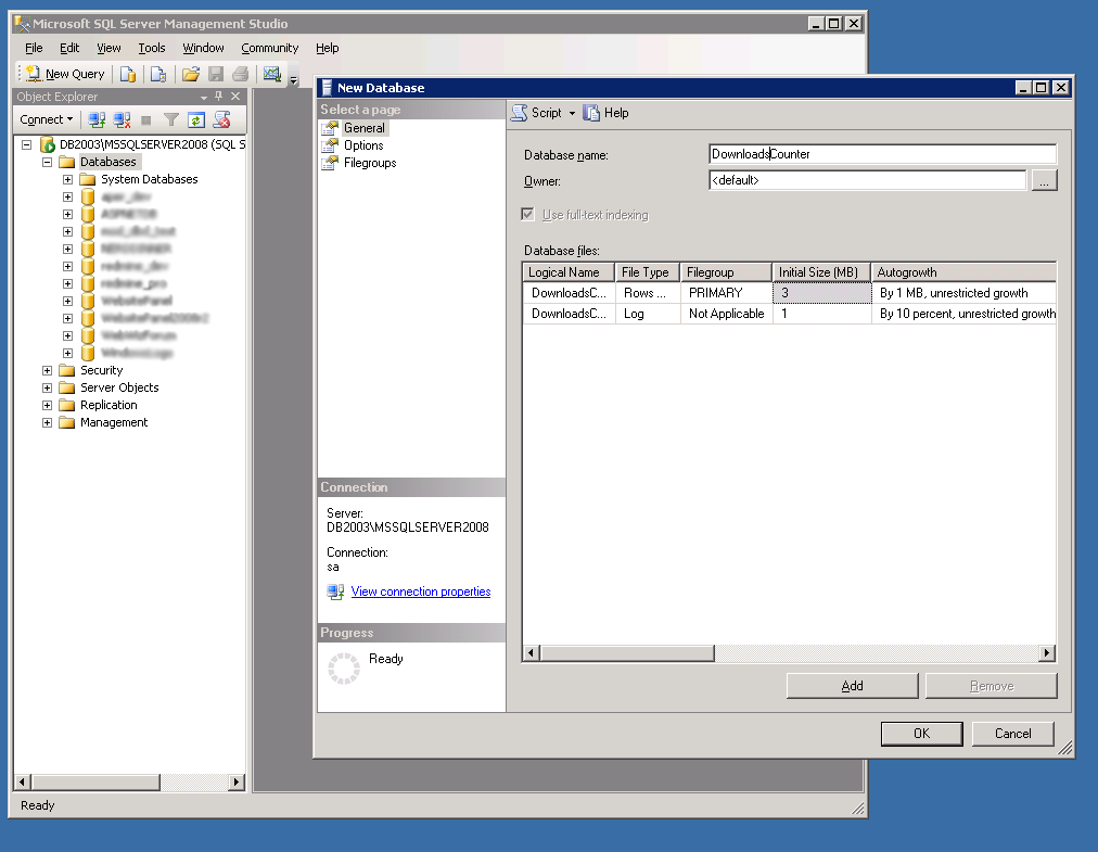 Right click on ‘Databases’, select ‘Create Database’, enter database name (for example ‘DownloadsCounter’) and click ‘OK’.