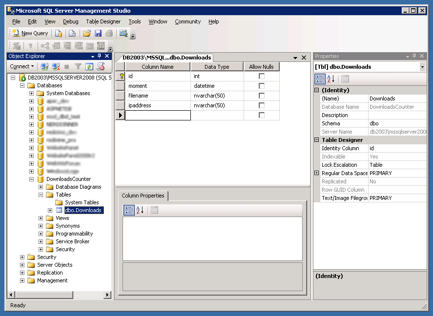 Unfold the DownloadsCounter in Object Explorer, right click on ‘Tables’ and select ‘New Table…’. Name the table ‘Downloads’ and add 4 fields: id (int), moment (datetime), filename (nvarchar(50)) and ipaddress (nvarchar(50)) as shown on the pic below. You can find sql script to create table in attached DownloadsCounterExample.zip.