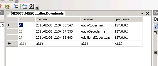 Save your .htaccess and try to download something from the browser. If you now throw a glimpse at the ‘downloads’ table in SQL Server Management Studio, you’ll see the records appearing in it: