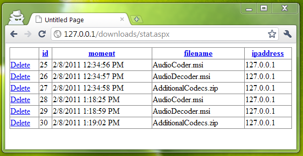 The archive attached to the article includes stat.aspx which does a very simple task—shows records from ‘downloads’ table.