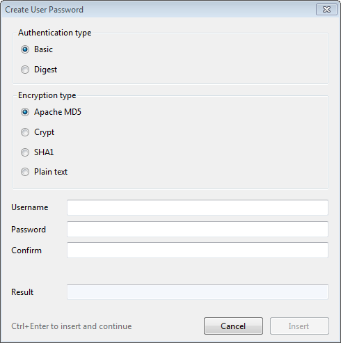 This utility allows you to generate passwords for Basic and Digest authentication types using MD5 or SHA1 encryption or plain text.