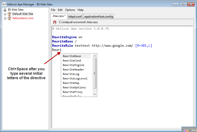 Helicon Ape Manager supports directives autocompletion which is invoked using standard Ctrl+Space hotkey.