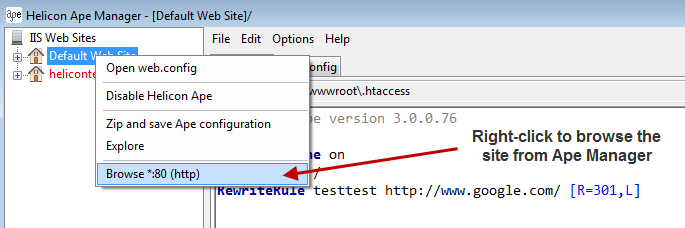Helicon Ape Manager allows to open any location of the website in default browser by simply right-clicking on desired resource and choosing one of supported protocols (ports).