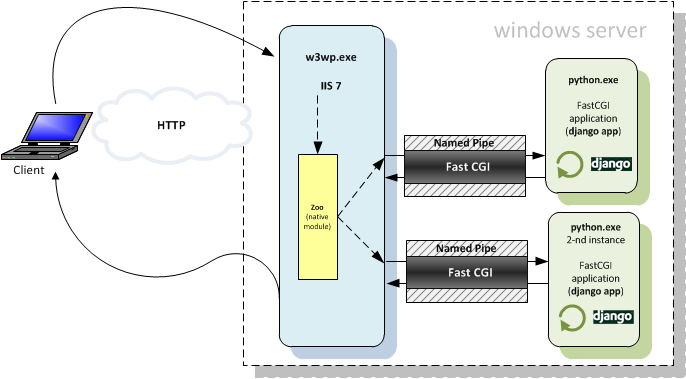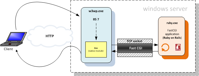 Zoo native module is an implementation of FastCgi protocol inside IIS7. FastCgi terminology distinguishes client and server. The server can be represented for example by Ruby on Rails application getting requests via FastCgi protocol and generating responses. Client in our case is Zoo native module which requests Ruby on Rails app via FastCgi protocol and sends data directly to the browser. So, Zoo native module acts as a mid-person between browser and Ruby on Rails app, it gets request from browser, gives them to Ruby on Rails, gets response from the latter and returns it to browser.